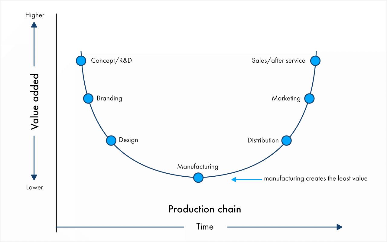 Распределение добавленной стоимости по цепочке создания продуктов в современном мире. Производство дает минимальные возможности для извлечения прибыли.