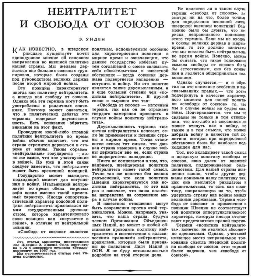 Перевод программной статьи Э. Ундена о политике нейтралитета Швеции на русский язык занял всего одну страницу (см. Рис. 1). Нейтралитет с целью сохранения его прочности как корабль Тесея было необходимо регулярно в напряженных обстоятельствах пересобирать, модифицировать и по-новому добиваться вокруг него широкого политического консенсуса. Наверное, отчасти в силу этих соображений Э. Унден так немногословен и сдержан при описании шведской внешнеполитической концепции. В своей статье 1957 г. он, в сущности, говорит, что адекватного и абсолютно точного термина для выражения содержания внешней политики Швеции не существует. Более того, несмотря на «почти единодушное мнение об основном направлении во внешней политике нашей страны», остается риск превращения «свободы от союзов» в «свободу действий», при которой можно «избрать войну в качестве той политики, которая при определенной обстановке была бы наиболее подходящей для нас».