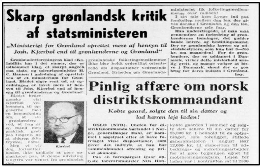 Отсутствие достаточного внимания к запросам и мнению гренландцев со стороны бывшей метрополии остается давней и болезненной проблемой. Так, даже после формальной «деколонизации» Гренландии в 1953 г. газета Information в октябре 1955 г. со ссылкой на гренландское издание Kalatdlit писала, что создание Министерства по делам Гренландии отдает «колониальным привкусом» и ведется ради конкретного датского политика Йоханнеса Кьербеля, а не самой Гренландии (см. Рис. 2).