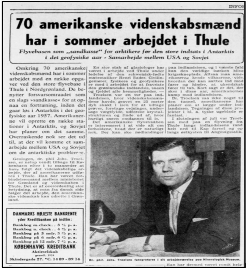 Датский ученый-геолог Йоханнес Троельсен выступал в роли «связующего» между Министерством по делам Гренландии, созданным в 1955 г., и научным персоналом американской авиабазы Туле, но, по крайней мере судя по открытым газетным статьям, не придавал большого значения тому, что США роют туннели в ледовом щите Гренландии, считая это больше фантастическим проектом и не видя его потенциальных военных целей (см. Рис. 3). Единственным публично заявляемым военным аспектом американской деятельности в Гренландии была, по сообщениям газет, заинтересованность американских ВВС в изучении структуры гренландского ледяного покрова для совершения экстренных посадок и подготовки к ведению потенциальных боевых действий в условиях низких температур.