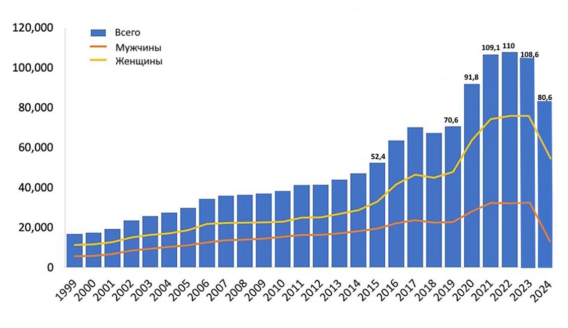 График 1. Количество зарегистрированных смертей от передозировки в США, 1999–2024 гг.