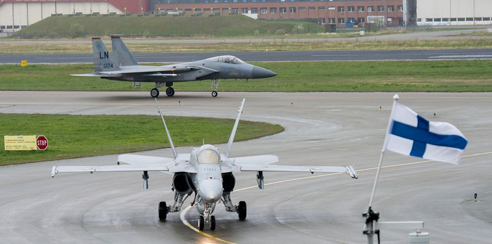 Истребитель F-15C ВВС США заруливает на стоянку вслед за финским F-18C "Хорнет". Учения Arctic Fighter Meet 2016