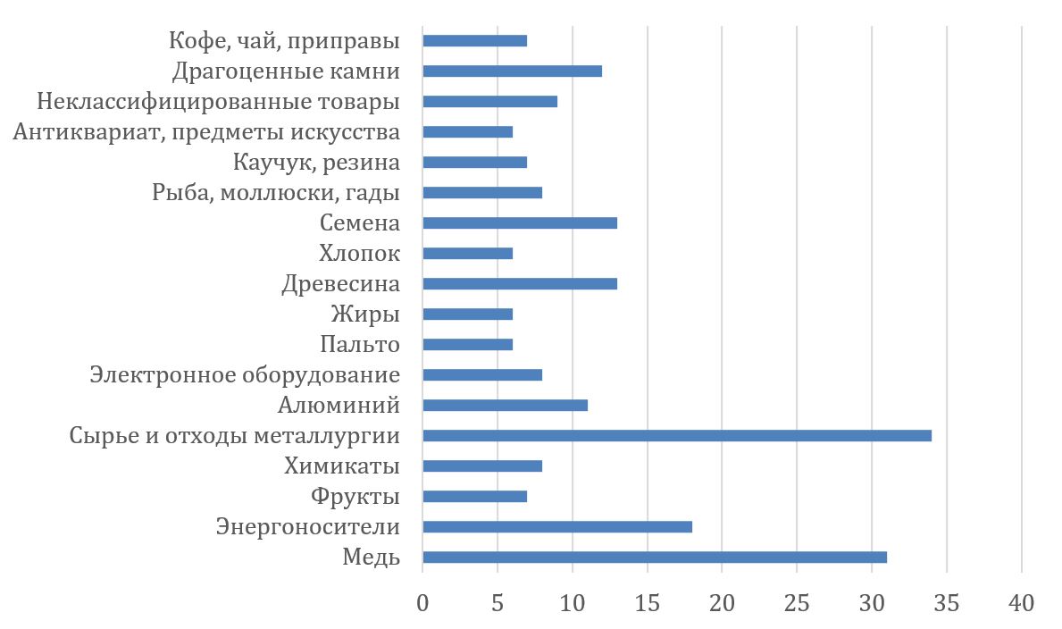 Новые правила экспорта потенциально способны повысить конкурентоспособность товаров стран АС на китайском рынке. Вместе с тем, несмотря на ресурсное и экономическое разнообразие, все 53 страны экспортируют в Китай преимущественно сырье, энергоносители, медь, алюминий, соль, семена и драгоценные металлы (Рис. 1). В структуре экспорта более чем 15 стран ряд таких товаров занимает более 80%. Открытие китайского рынка позволяет существенно диверсифицировать экспорт, улучшить национальное благосостояние промышленных районов стран — членов АС.