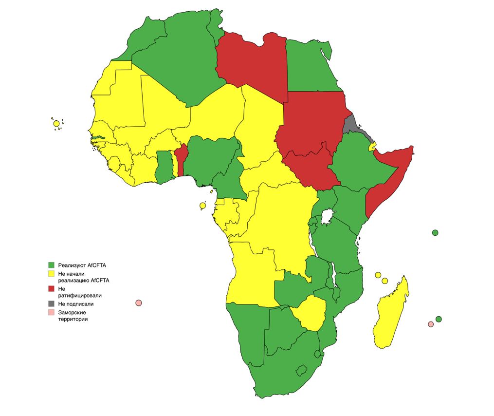 К 2026 г. соглашение подписали 54 из 55 стран АС (кроме Эритреи), ратифицировали — 49 (кроме Ливии, Судана, Южного Судана, Сомали и Бенина). При этом только 24 страны АС исполняют условия AfCFTA, из них только 14 напрямую граничат друг с другом. Китайские компании уже сейчас могут использовать AfCFTA, поскольку страны, исполняющие соглашение, связаны в логистическую сеть китайскими инфраструктурными инвестициями. Расширение географии действия соглашения позволит компаниям из КНР открыть производство в Африке для нужд собственного внутреннего рынка, получив преимущество перед отечественными конкурентами за счет доступности ресурсов, более дешевой рабочей силы и нулевых ввозных пошлин.