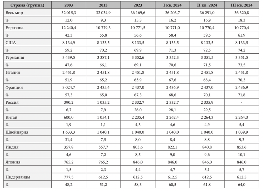 Рисунок 3 Мировые резервы золота (тонны), % от совокупных золотовалютных резервов страны. Источник: Барабанов В. Ю., Протосеня А. Д. Финансовая система Ирана в условиях санкционного давления: роль криптовалют и альтернативных платежных механизмов // Мировая экономика и мировые финансы. - 2024. - №5. - С. 100.