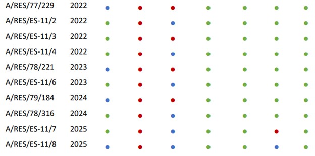 Serbia’s UNGA voting record on resolutions concerning Ukraine, as presented in Table 1, reveals a complex and evolving pattern. Considering the overall voting distribution, Serbia appears to maintain a degree of neutrality, while slightly leaning toward Russia, likely reflecting their shared values. This is evident in its votes as it voted “No” on roughly 43% of resolutions, “Yes” on 30%, “Abstained” on 22%, and “Not-voting” on 4%. However, 2022 represents a clear turning point in Serbia’s voting behavior.