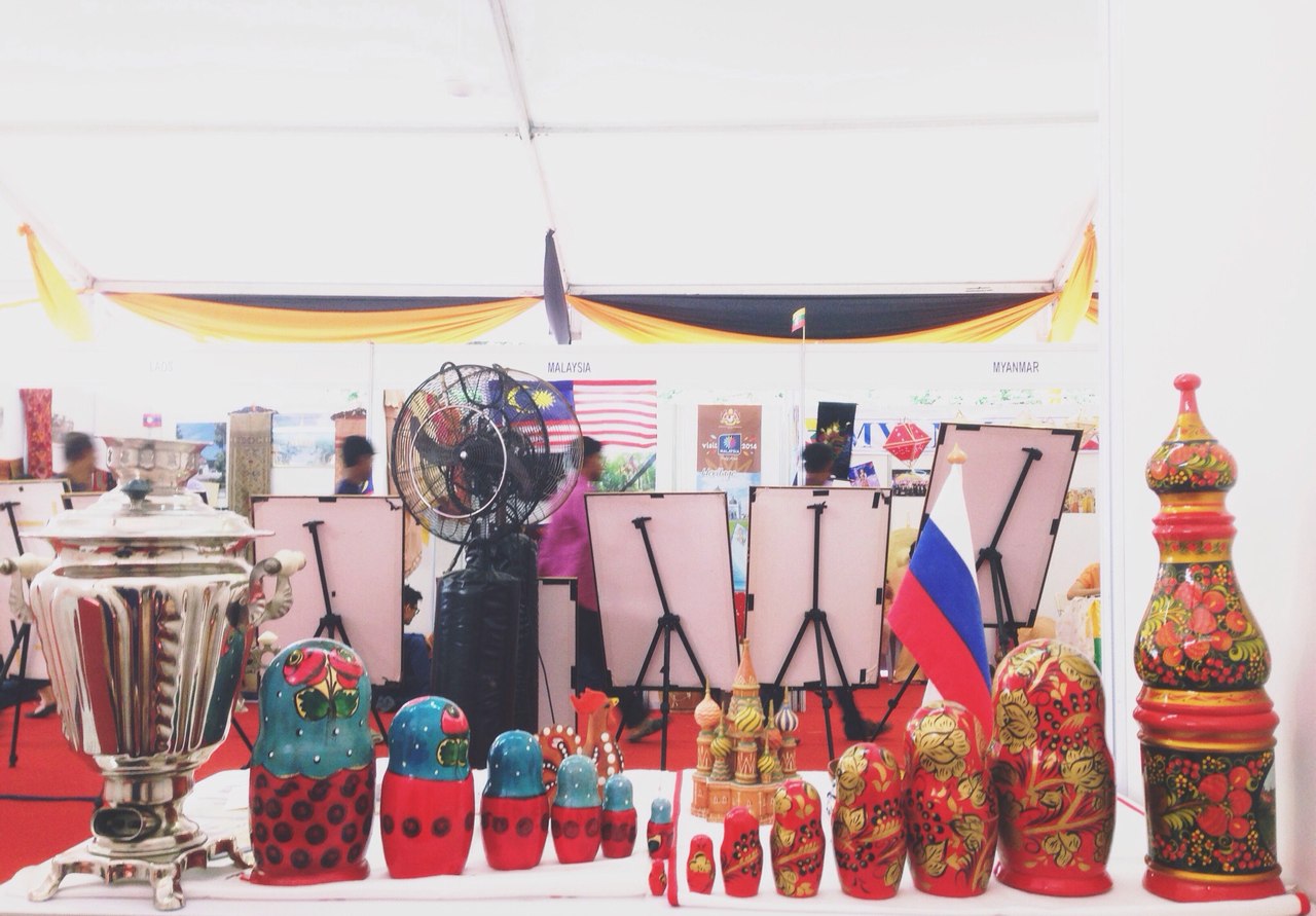 Then we continue preparing our booth and at the same time we try to attend other countries booths also as there is so much interesting stuff there. We ourselves out from showing matreshka-samovar-sushki things drew a map of Russia with all the interesting places and showed it to the guests and explain some things; people get really shocked when they hear about like the amount of the time zones in Russia or the time it takes to go across the country using train. Also we have a special stand to learn Russian language; there is alphabet and also some basic phrases in English and their pronunciation with english letters. People try to this with a real excitement. So the exhibition is basically ready, already we got a lot of visitors in our booth. The next two days it is going to be really crowded down here.