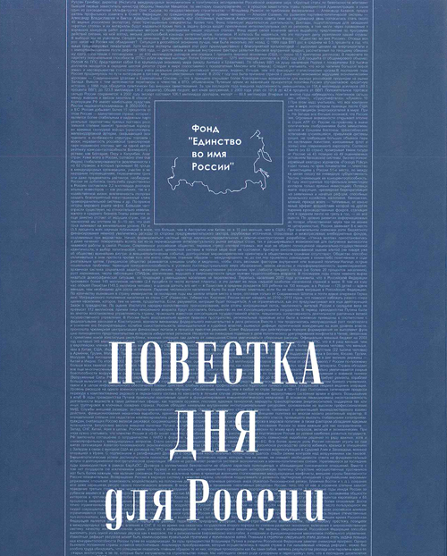 «Повестка дня для России», под редакцией В.А. Никонова, аккумулирует материалы круглых столов, организованных Фондом в 2004 г. В книге представлены аналитические доклады, приготовленные известными политиками, политологами, ведущими экономическими экспертами России, а также материалы их обсуждений. В числе авторов сборника Руслан Гринберг, Александр Дынкин, Владимир Егоров, Виктор Кувалдин, Андраник Мигранян, Вячеслав Никонов, Алексей Салмин, Александр Ципко, Евгений Ясин и др. В сборнике отражены острые дискуссии по злободневным вопросам, находящимся в эпицентре общественного внимания. Среди таких тем: проблемы развития экономики и бизнеса, образование и здравоохранение России, избирательные системы и партии, взаимоотношение со странами СНГ, угроза терроризма и др.